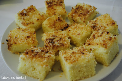 Plech som vymastila maslom, vysypala strúhaným kokosom. Zmes som vyliala na plech a ešte neupečené cesto posypala cukrovo-kokosovou posýpkou. Pečieme vo vyhriatej rúre na 190°C asi 20-30 minút. Ešte teplé polejeme smotanou na šľahanie (3 po 180ml).